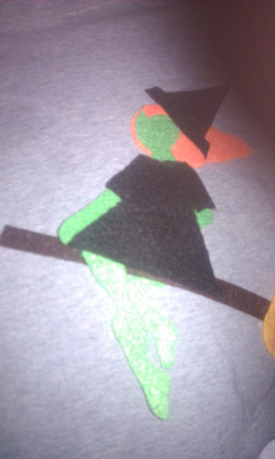 The guy appeared to have cut out felt shapes of Halloweeny stuff (witch, ghost, pumpkin) on his T-shirt.