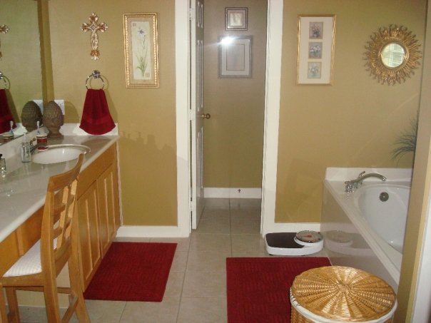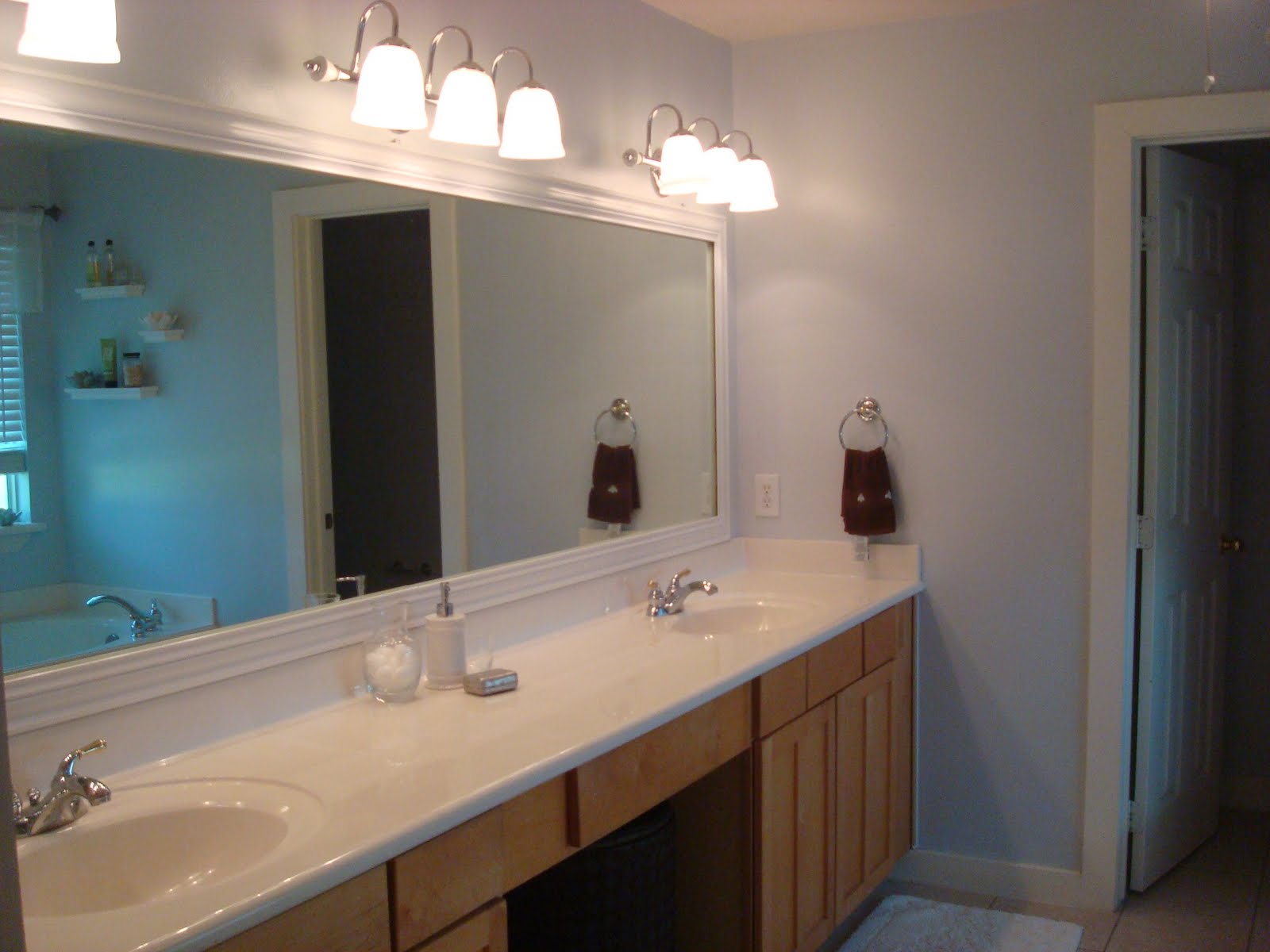 View from the little potty room. See that lil cabinet on the wall. Its awesome! I keep all my lotions, and perfumes and nail polishes in there. Its soooo nice. We framed out the big builder mirror like we did in the boys bathroom. But I had to paint this trim. Which was not fun. (also thats baby Sheldon… he’s 50lbs now. big baby)