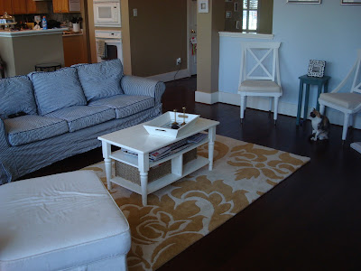 Blue curtains and couch with a yellow rug? yes sir! (flutter flutter! anyone?)