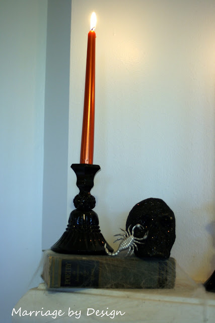 This is exactly what you think it is. I lit the candles to take pictures and one of the candles lit the fake webs on fire. Whatev. now it looks creepier. Husband was so proud of me.