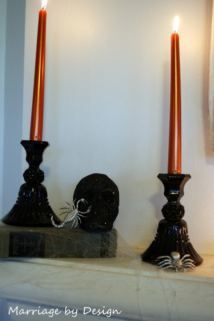 I have 3 of these lined up in the center. Didnt want anything too tall to take away from my spider lights. Now, my mother in law will probably kill me, but these are glasses that Husband’s Grandmother gave us with our china. I think they look Halloweeny.