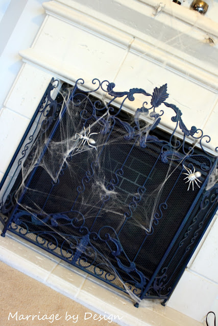 I got lazy when it came to the fireplace screen. webs+leftover silver spiders=what you see above. I may end up putting a black light facing up between the screen and the fireplace glass for the party. But only if I can find Husband’s sweet blacklight from college.