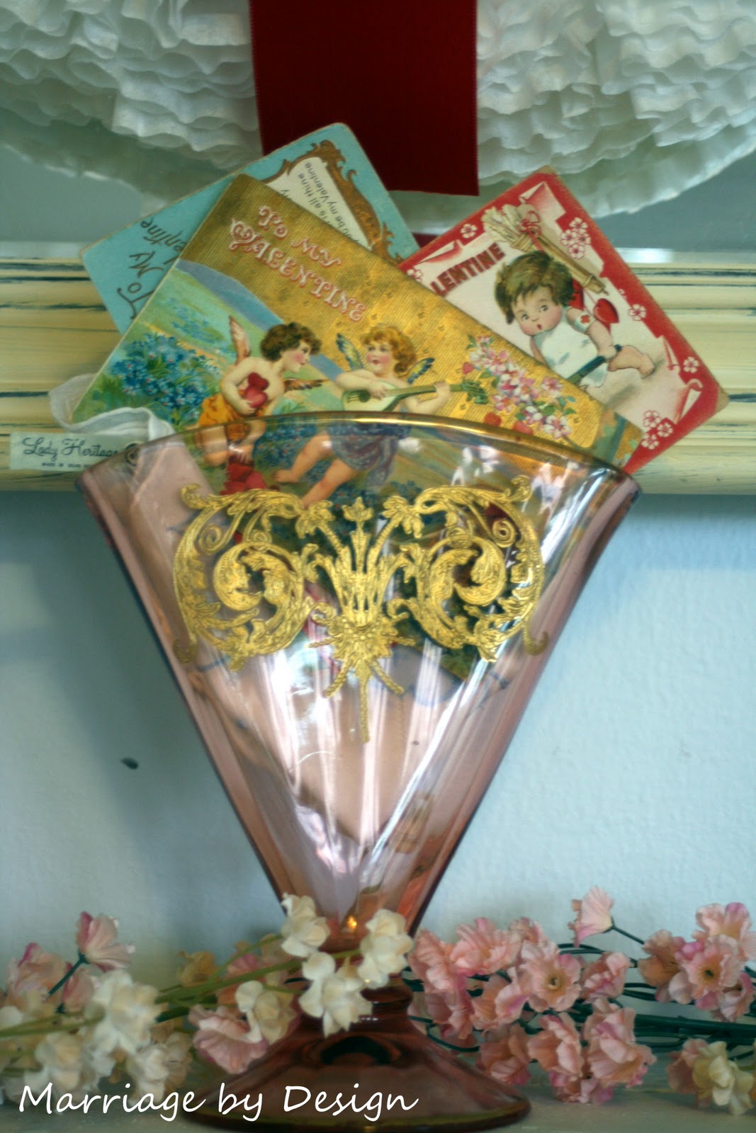 This, I was told, is a handkerchief holder. I got it as a Bridal Shower gift. I opened it and squealed (I heart pink) and gushed all over the place about how super cute this vase was. After about 5 minutes of making a complete doodle out of myself, somebody told me what it actually was. Now it houses antique Valentines year round in former Roommate #2’s room. It will live on the mantle until March.